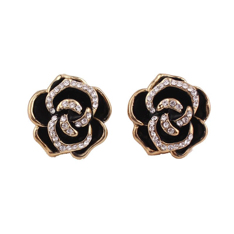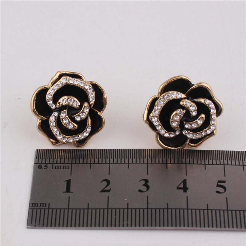 Vintage Black Rose Flower with Rhinestone Clip-on Earrings.