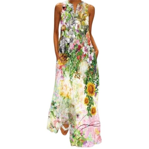 Long Dress. V-Neck. Sleeveless. Multicolored.