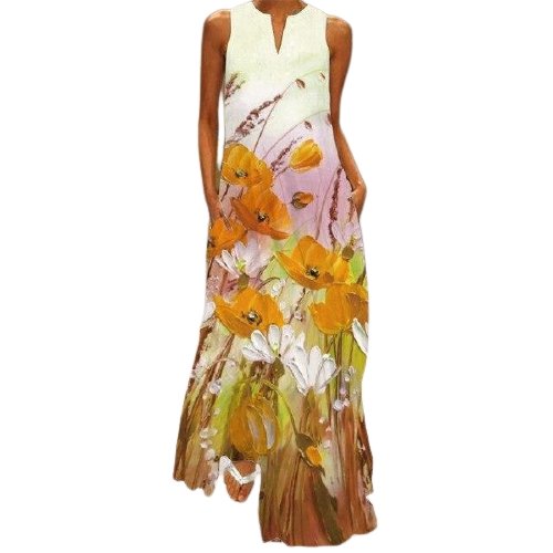 Long Dress. V-Neck. Sleeveless. Multicolored.