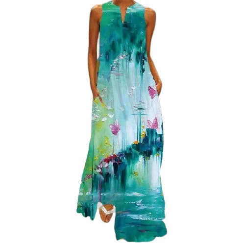 Long Dress. V-Neck. Sleeveless. Multicolored.