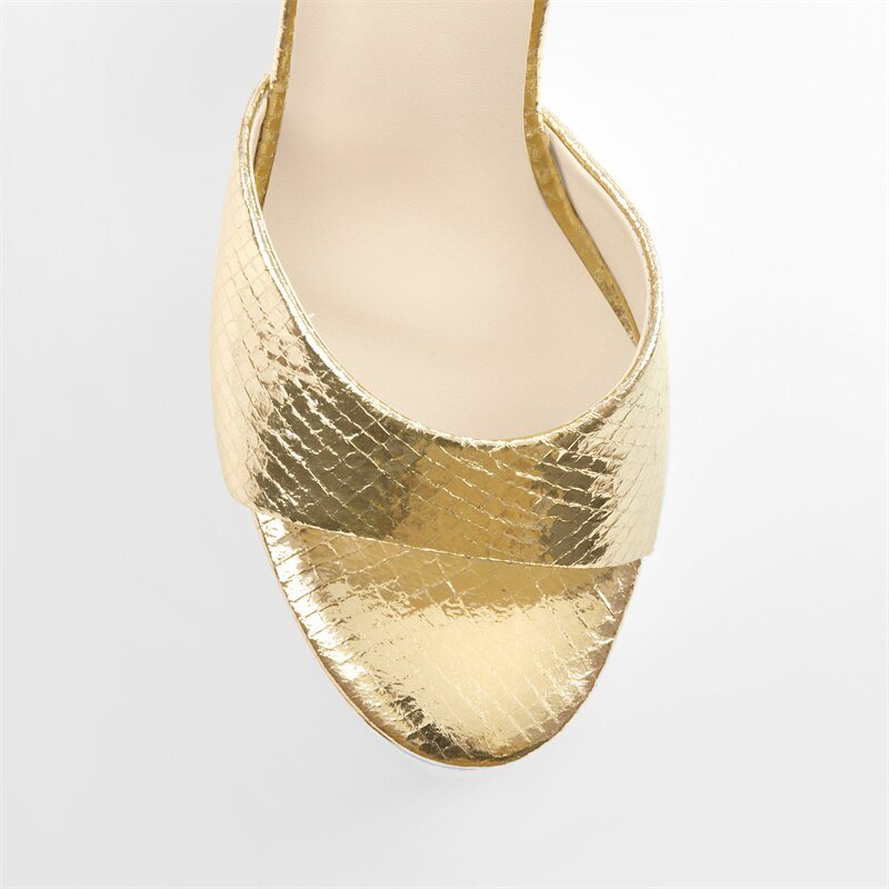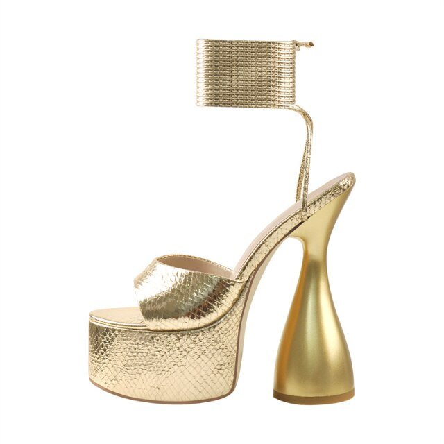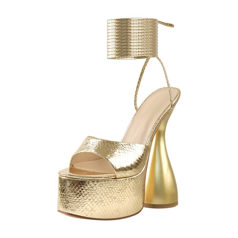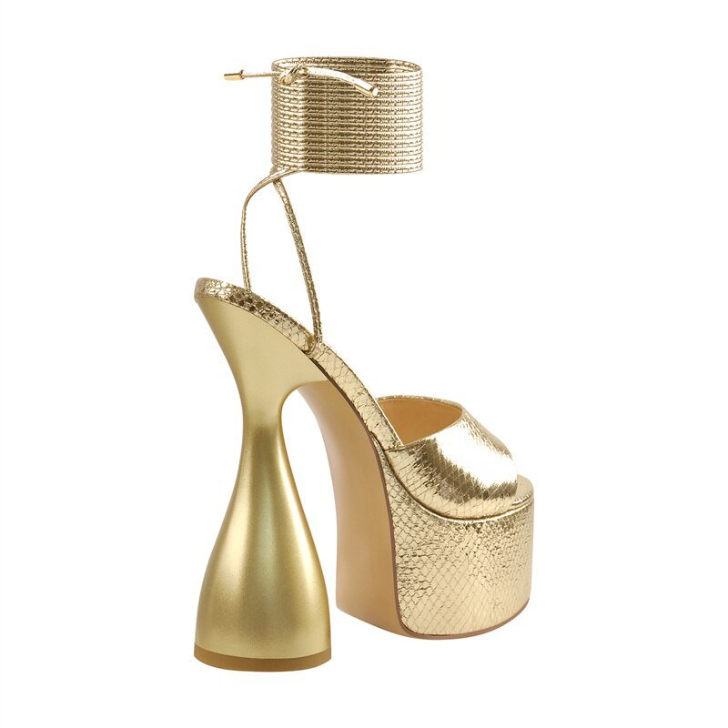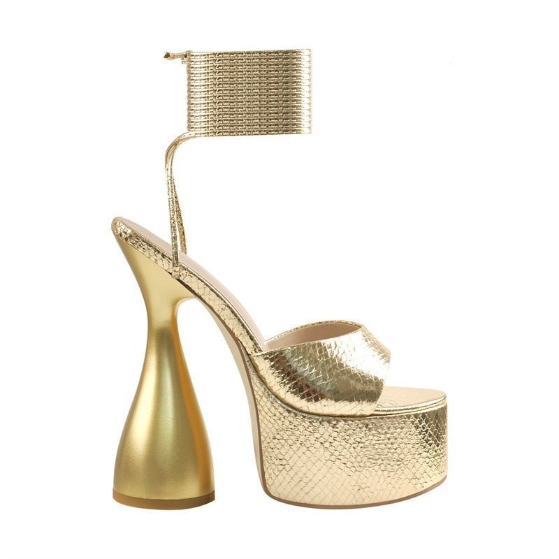 Handmade sandals with high heel and peep toe. Spike heel, with platforms, and crocodile print.