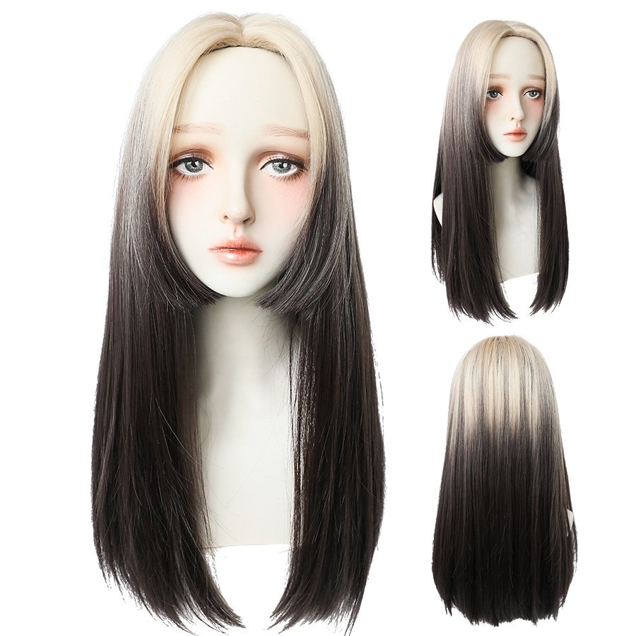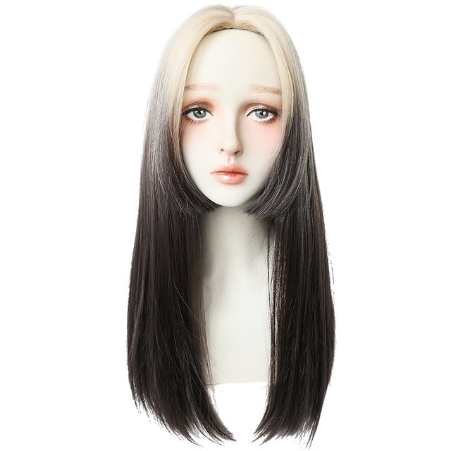 Handmade synthetic hair wig, long with bangs, black and white double color.
