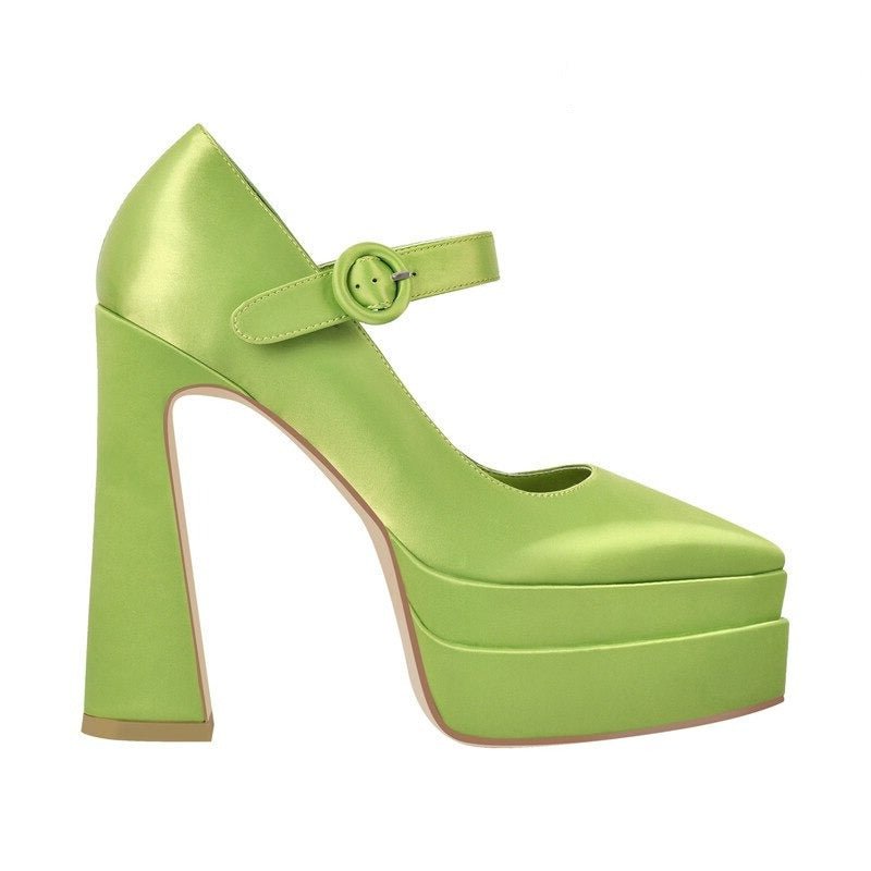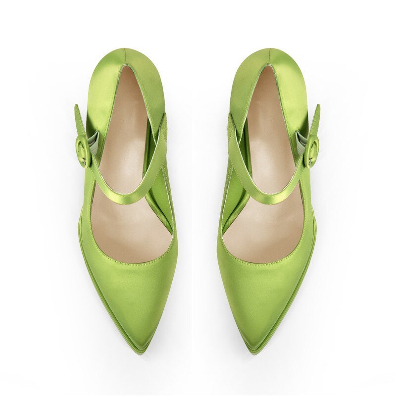 Handmade shoes, with high heels and pointed toe. Chunky heel with platforms and ankle strap.
