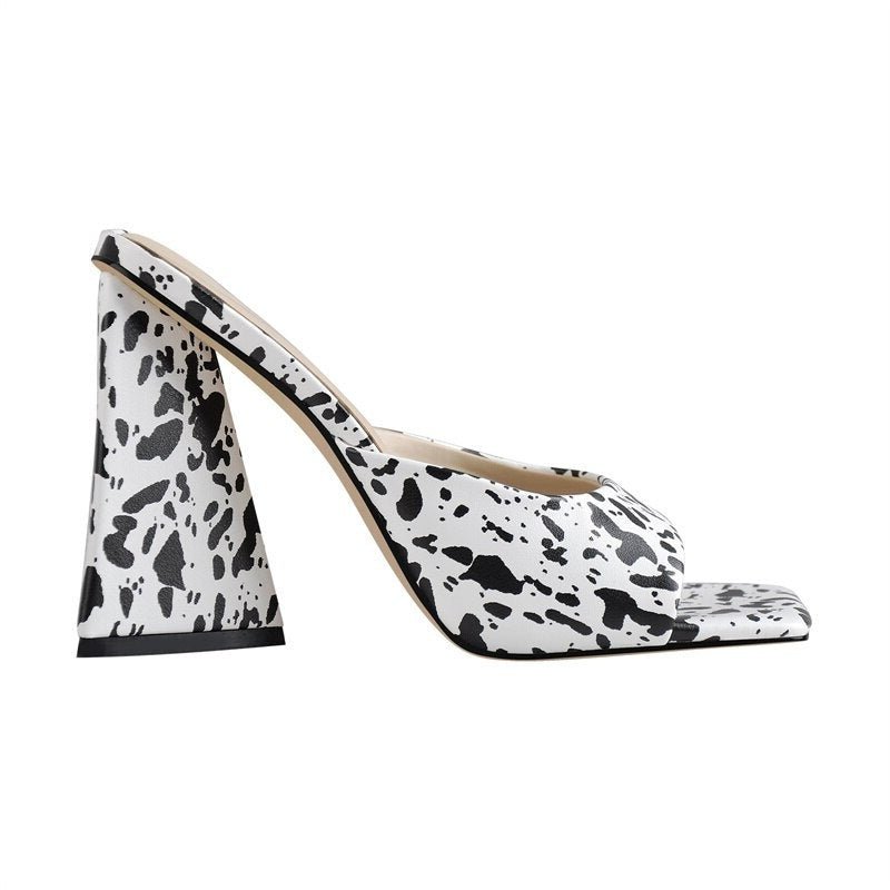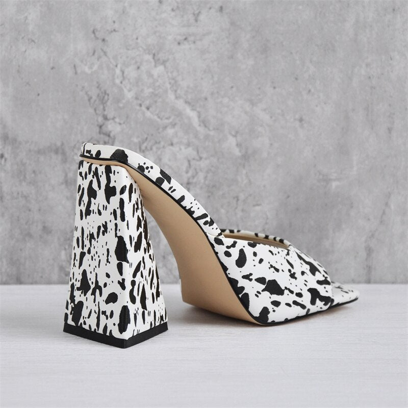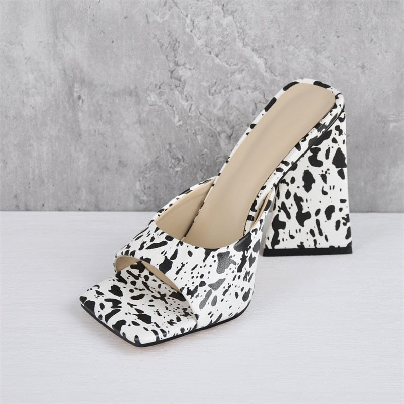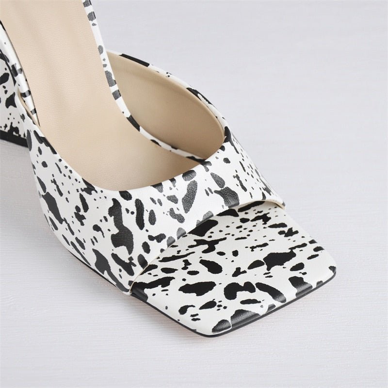 Handmade sandals with high heel and open toe. Elegant design and square heel. Zebra color.